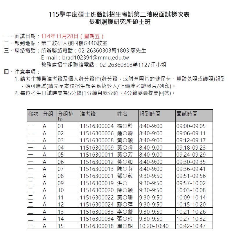 [2025/11/12] 【重要公告】115學年度碩士班甄試入學招生-口試時間表及注意事項
