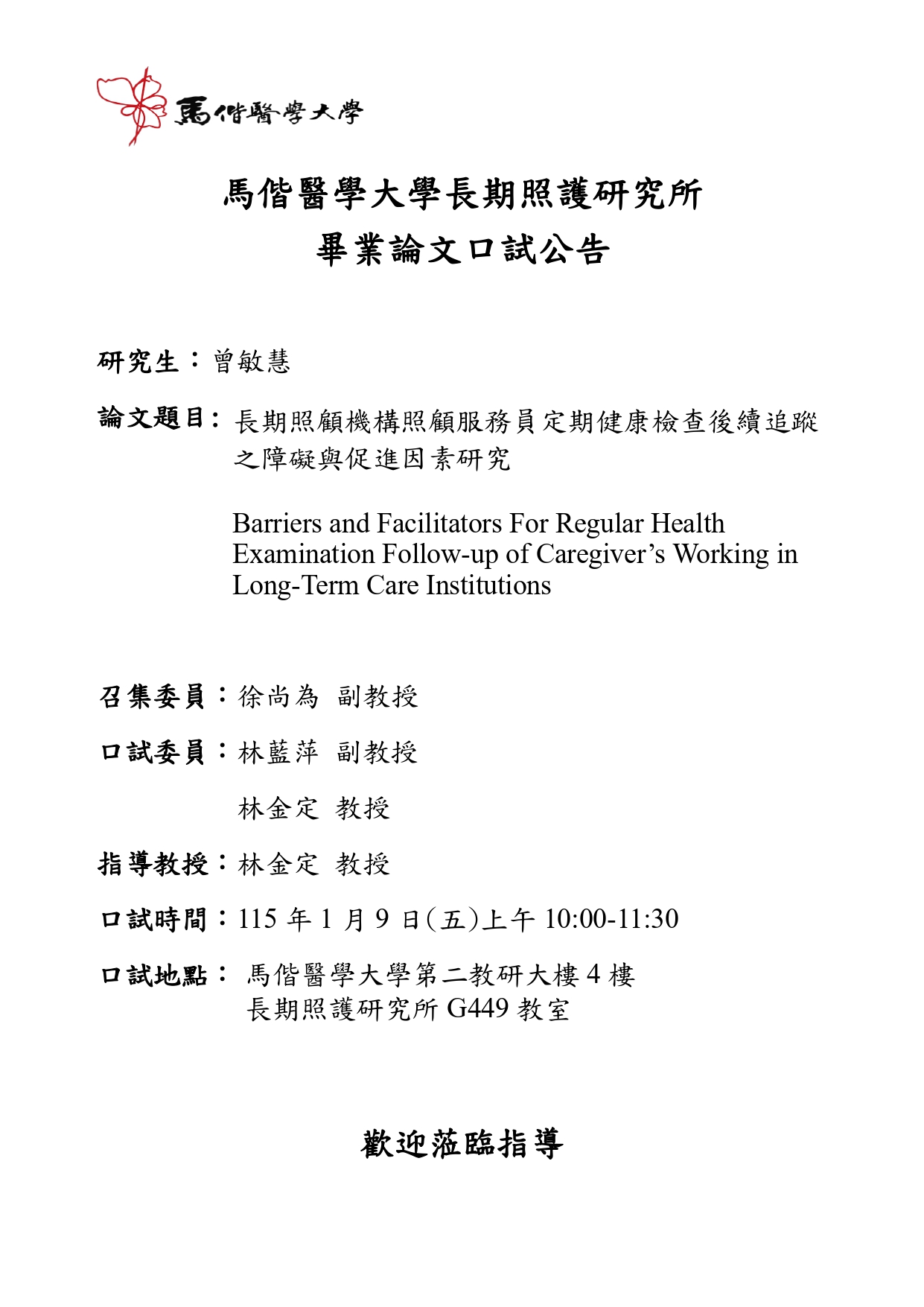 [2025/12/15] 【學位考試】長期照護研究所碩士在職專班曾敏慧同學學位論文口試1150109
