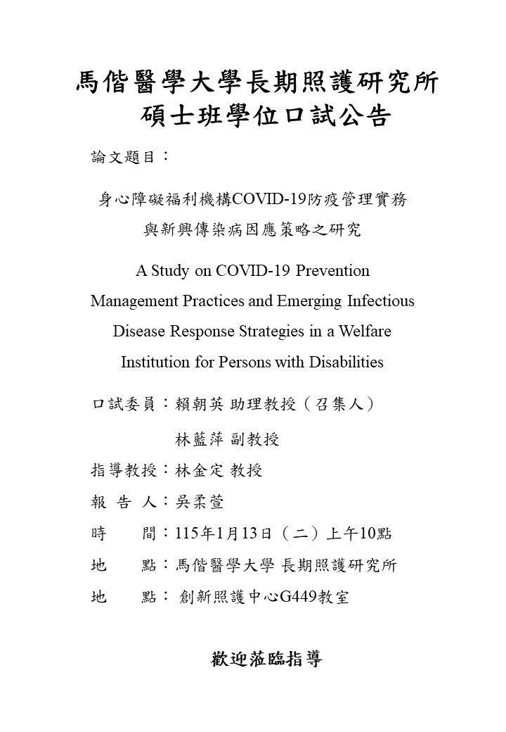 [2026/01/05] 【學位考試】長期照護研究所碩士班吳柔萱同學學位論文口試1150113