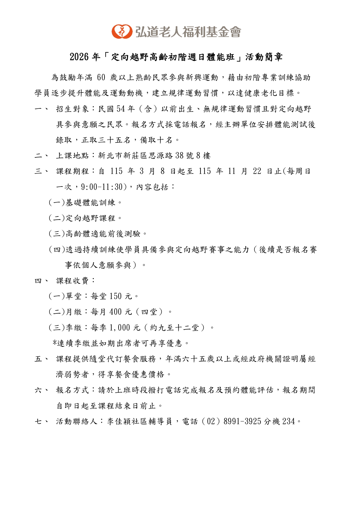 [2026/01/05] 【校外活動】弘道老人福利基金會舉辦2026年「定向越野高齡初階週日體能班」,歡迎報名參加。