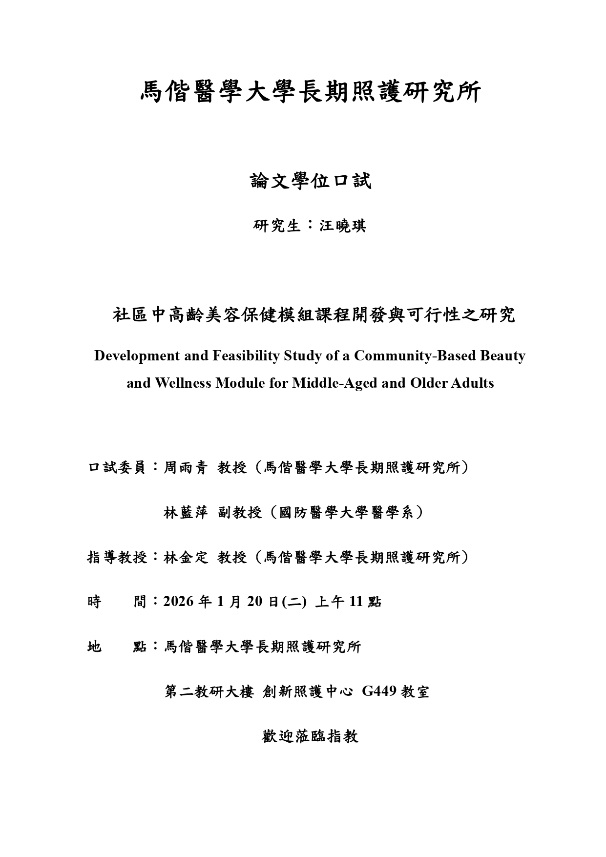 [2026/01/13] 【學位考試】長期照護研究所碩士在職專班汪曉琪同學學位論文口試1150120