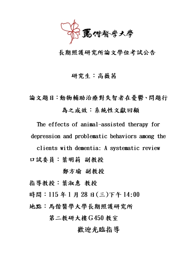 [2026/01/15] 【學位考試】長期照護研究所碩士班高薇茜同學學位論文口試1150128